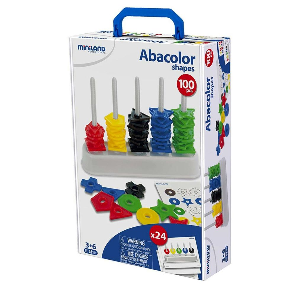 Il riconoscimento dei colori, delle forme e dei numeri, la capacità di contare e di raggruppare sono solo alcune possibilità d’insegnamento che questo gioco consente. La confezione contiene 50 pezzi in 5 forme e in 5 colori diversi e 18 schede/esempi che favoriscono un divertente gioco di memoria. Abaco “Shape‘n color” in plastica dimensioni: cm.5 x 25 x 16,5 h