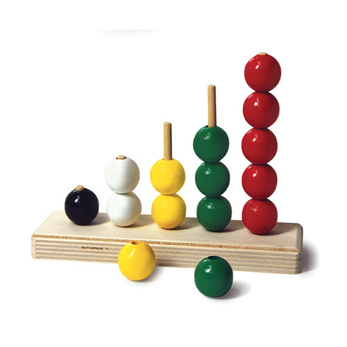 Abaco sequenziale in Legno, numeri da 1 a 5. I concetti fondamentali che l' abaco consente di sviluppare sono: 1. I Numeri: imparare i numeri da uno a dieci. 2. I Colori: associare ogni colore a un valore numerico. 3. I Calcoli: eseguire le prime operazioni aritmetiche con i cilindretti. Dimensioni: 19x6x1,8 cm.