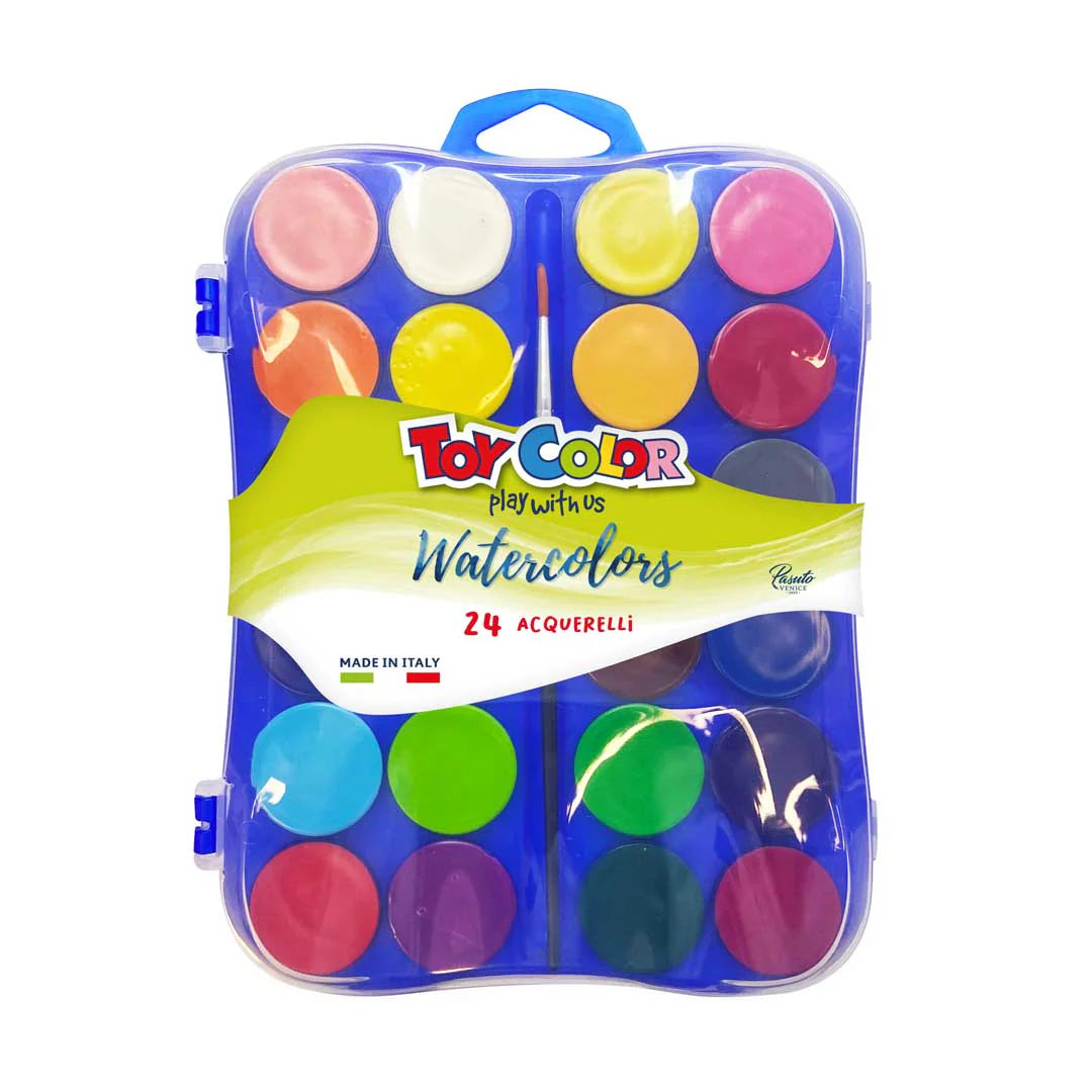 Gli acquerelli Toy Color sono made in Italy, hanno un sistema produttivo in forma liquida, esclusivo di Pasuto, offrono una texture cremosa, una resa cromatica eccezionale e permettono di creare infinite sfumature. Le pastiglie hanno diametro 30 mm. Il coperchio è stato progettato per diventare una tavolozza grazie alle sue concavità.