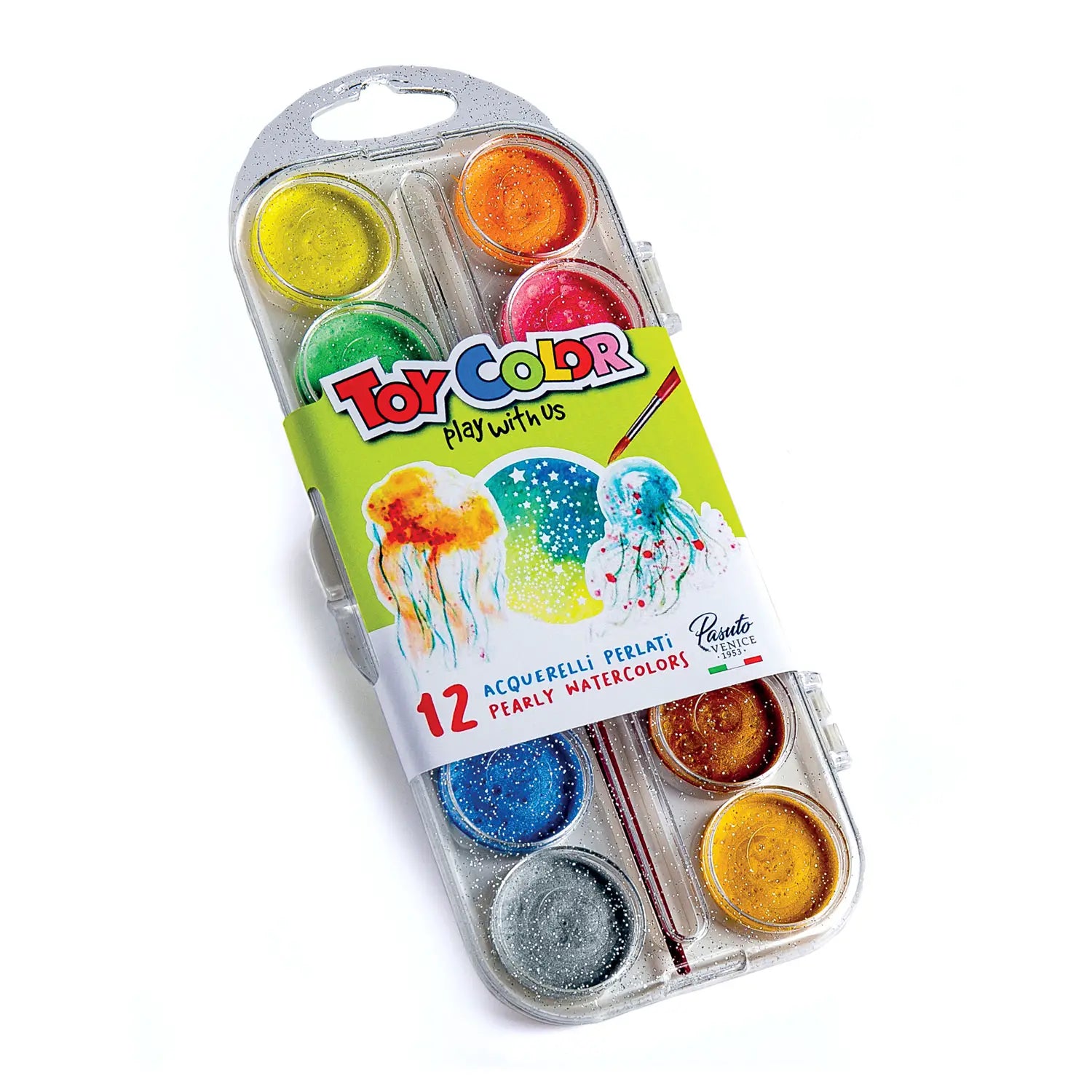 Disponibili in una confezione in plastica appendibile con 12 acquerelli perlati.
