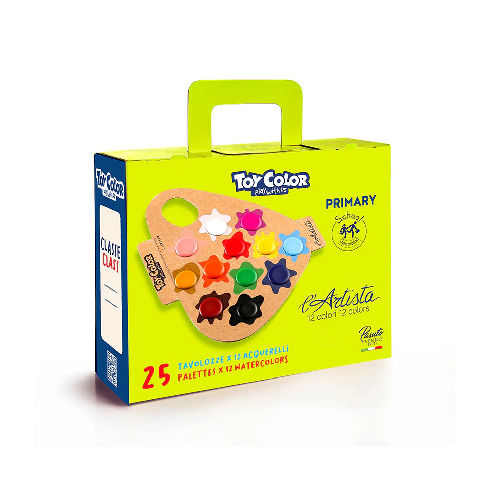 Valigetta per la scuola primaria contenente 25 tavolozze ecologiche da 12 Acquerelli "L’Artista", specificamente pensate per l’utilizzo in classe e per la didattica all’aperto. Una tavolozza per ogni bambino, nella sua bustina singola.