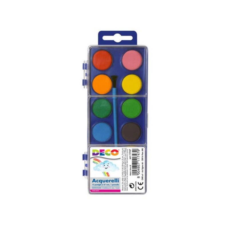 Acquerelli da  12 pastiglie con diametro cm.2.1. Ottimo rapporto qualità-prezzo. Adatti per uso scolastico, hobbistico e dilettantistico. Colori Brillanti. Incluso un Pennello. Nel nostro sito sono disponibili varie versioni di acquarelli Deco.