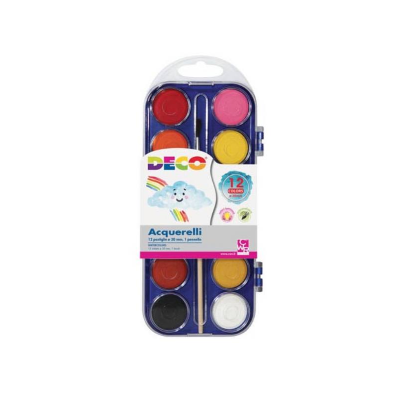 Acquerelli da  12 pastiglie con diametro cm 3 . Ottimo rapporto qualità-prezzo. Adatti per uso scolastico, hobbistico e dilettantistico. Colori Brillanti. Incluso un Pennello. Nel nostro sito sono disponibili varie versioni di acquarelli Deco.