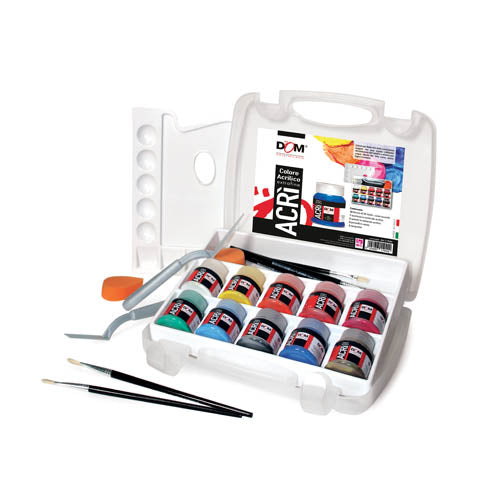 Contenuto: 10 Flaconi acrilici ml.60 colori assortiti, 1 tavolozza in acrilico, 2 spatole in acrilico, 6 pennelli in pura setola e 2 spugnette.