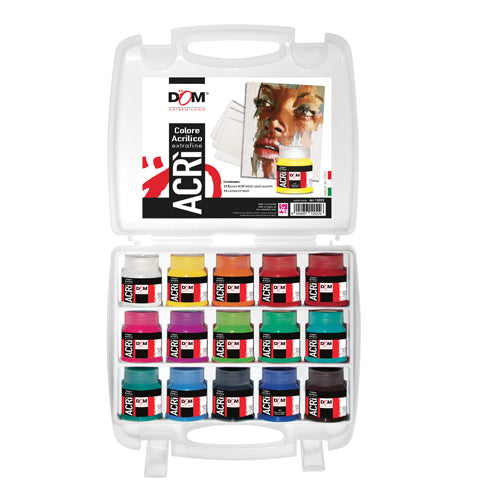 Contenuto: 15 Flaconi acrilici ml.60 colori assortiti e 15 cartoncini telati.
