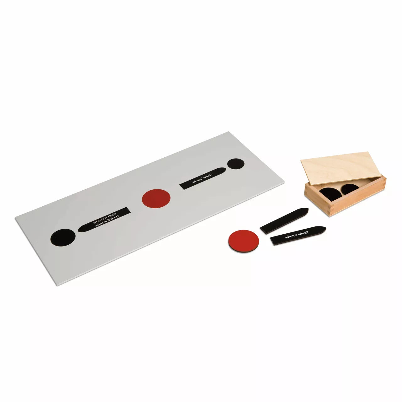 La prima tavola e la relativa scatola introducono il predicato, soggetto e complemento oggetto. Il set comprende una tavola e una scatola di legno contenente cerchi e frecce con le domande stampate per iniziare l'analisi.