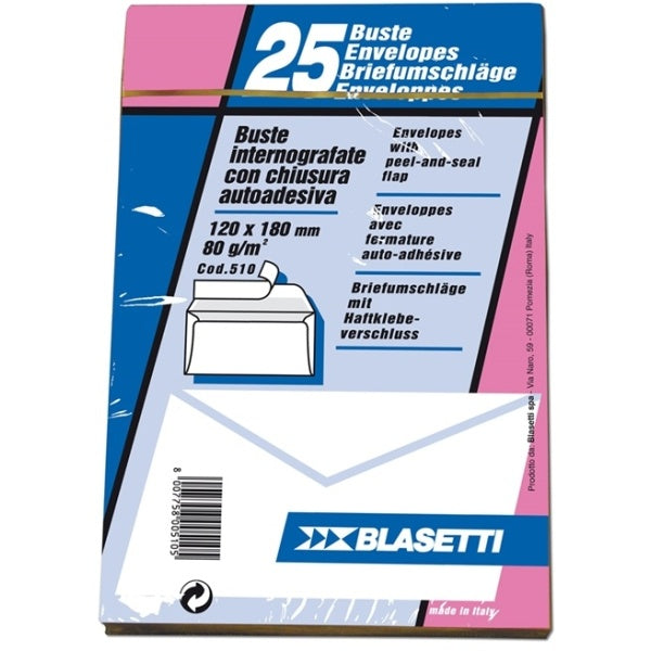 Buste internografate senza finestra 12x18cm 80gr con adesivo strip per la chiusura. In confezione minipack da 25 buste.
