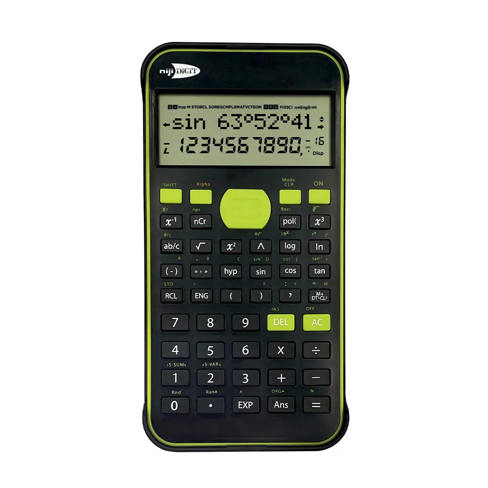 Calcolatrice scientifica 10+2 cifre da 240, dotata di display a due righe, custodia e libretto d’istruzioni.