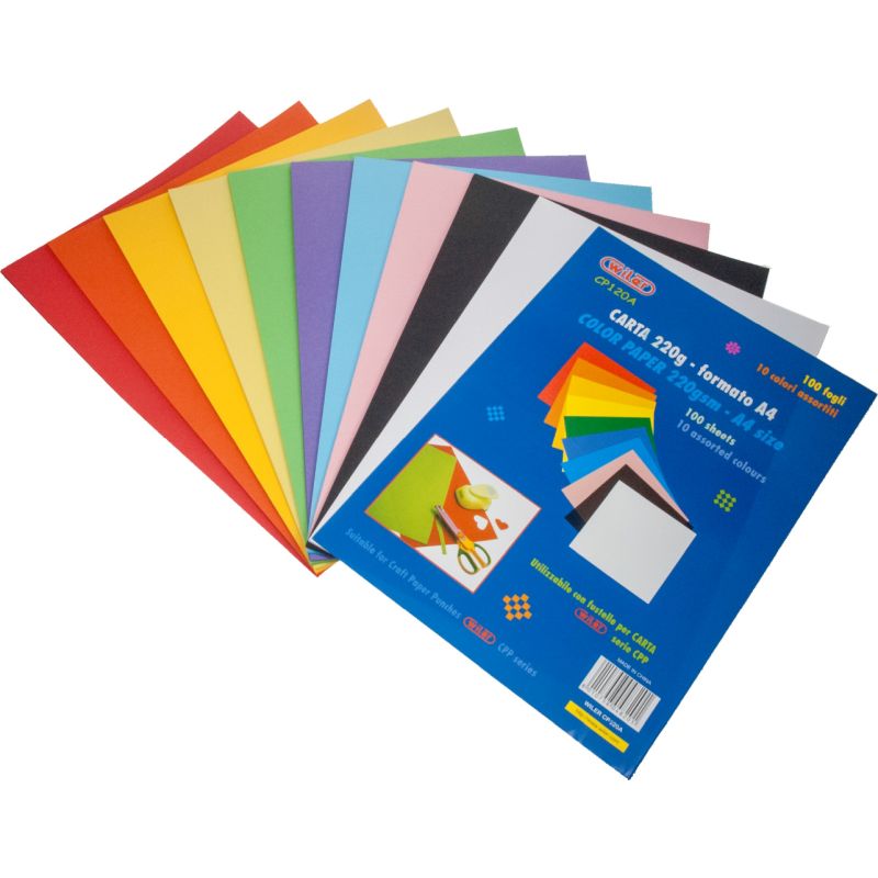 Cartoncino colorato A4. Grammatura: 220g. Dimensione: 210x297mm (A4). Confezione: Scatola da 100 Fogli (10 fogli Per Colore: Bianco, Giallo, Rosso, Verde, Arancione, Giallo scuro, Nero, Viola, Celeste e Rosa) . Utilizzabili con fustelle per la carta.