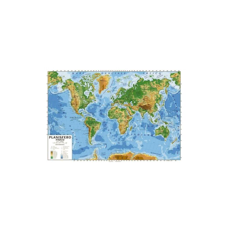 Stampata su materiale plastico lavabile resistente alla lacerazione e all’usura. Completata con aste in trafilato plastico, eleganti e resistenti, munite di appositi ganci che si possono regolare in larghezza per appendere la carta alla parete. Rappresentazione fisica da un lato e politica dall’altro. Dimensioni: cm 100x140 (scala 1:1.100.000). Territorio: Planisfero. Le carte vengono consegnate in custodie tubolari resistenti, per proteggerle e conservarle.