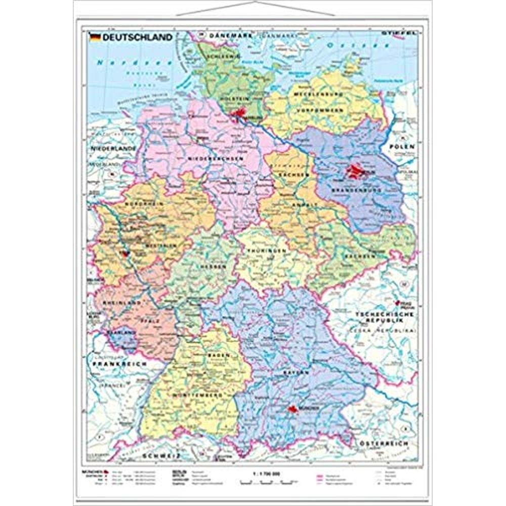 Stampata su materiale plastico lavabile resistente alla lacerazione e all’usura. Completata con aste in trafilato plastico, eleganti e resistenti, munite di appositi ganci che si possono regolare in larghezza per appendere la carta alla parete. Rappresentazione fisica da un lato e politica dall’altro. Dimensioni: cm 100x140 (scala 1:1.100.000). Territorio: Germania. Lingua: Tedesco. Le carte vengono consegnate in custodie tubolari resistenti, per proteggerle e conservarle.