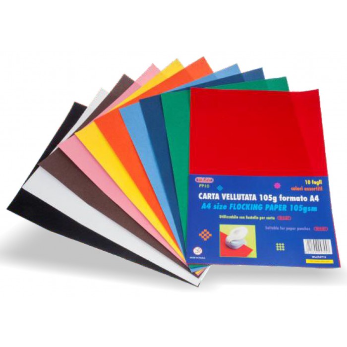 Confezione di carta vellutata, effetto panno, morbida e resistente a qualsiasi tipo di collante. Può essere applicata su svariati materiali, in particolare su quelli porosi come cartoncini e carta.