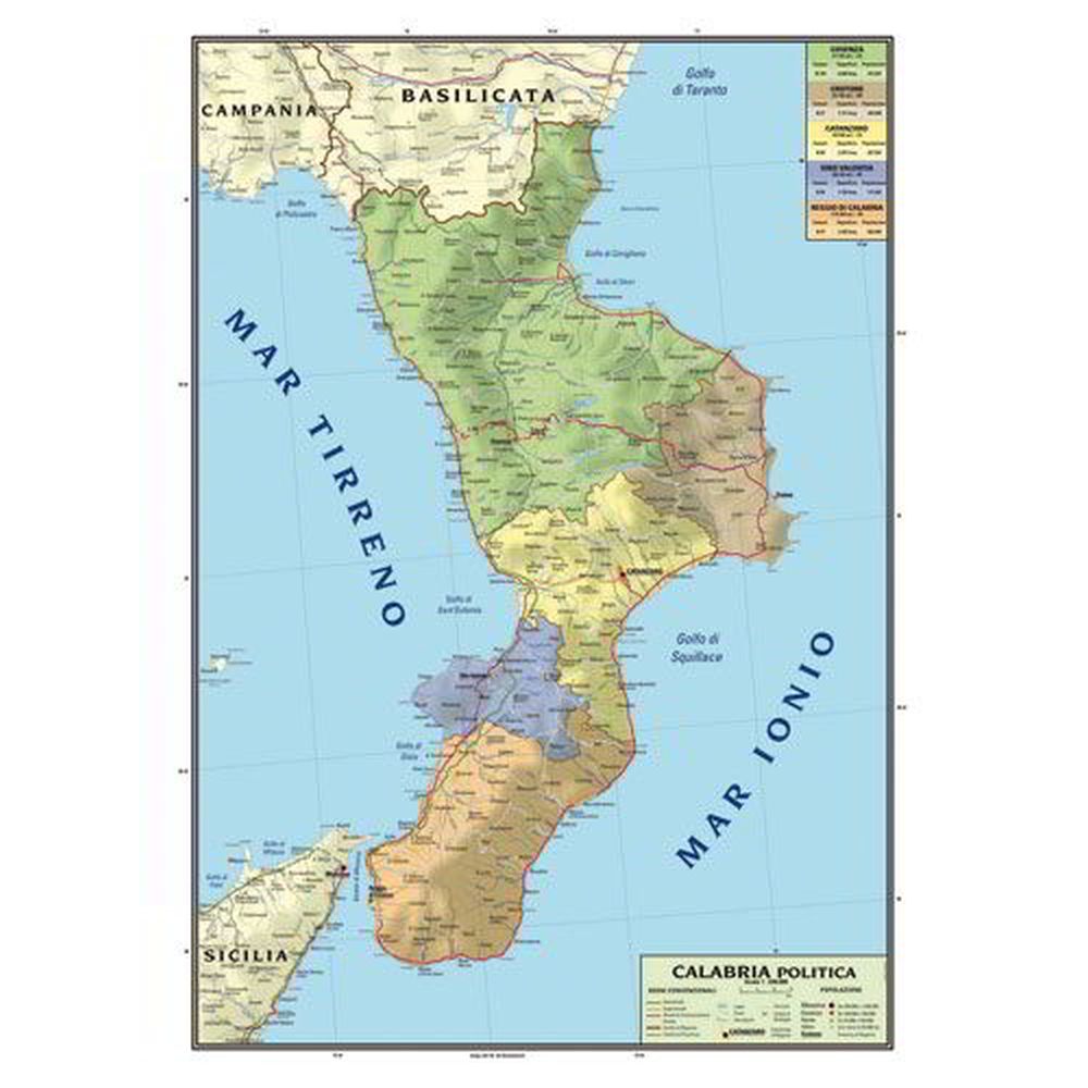 Stampata su materiale plastico lavabile resistente alla lacerazione e all’usura. Completata con aste in trafilato plastico, eleganti e resistenti, munite di appositi ganci che si possono regolare in larghezza per appendere la carta alla parete. Rappresentazione fisica da un lato e politica dall’altro. Dimensioni: cm 100x140 (scala 1:1.100.000). Territorio: Calabria. Le carte vengono consegnate in custodie tubolari resistenti, per proteggerle e conservarle.