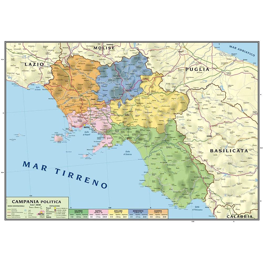 Stampata su materiale plastico lavabile resistente alla lacerazione e all’usura. Completata con aste in trafilato plastico, eleganti e resistenti, munite di appositi ganci che si possono regolare in larghezza per appendere la carta alla parete. Rappresentazione fisica da un lato e politica dall’altro. Dimensioni: cm 100x140 (scala 1:1.100.000). Territorio: Campania. Le carte vengono consegnate in custodie tubolari resistenti, per proteggerle e conservarle.
