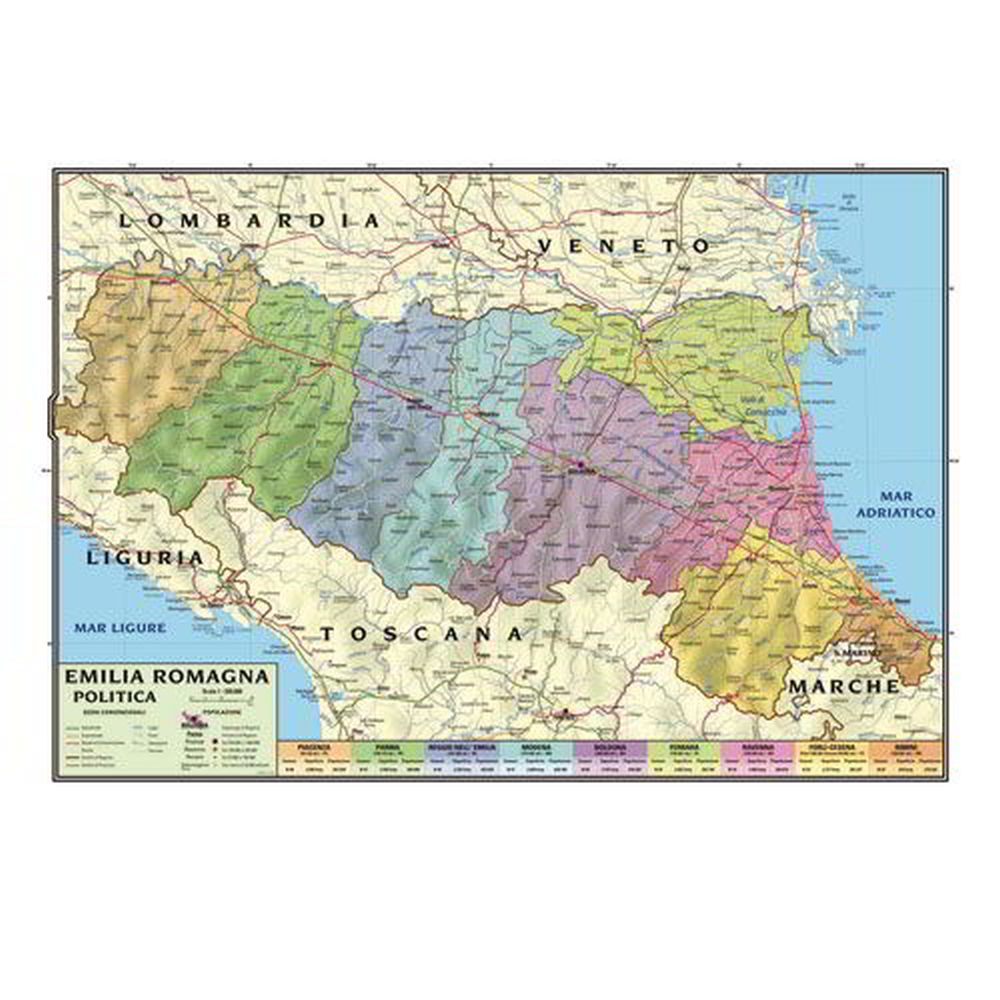 Stampata su materiale plastico lavabile resistente alla lacerazione e all’usura. Completata con aste in trafilato plastico, eleganti e resistenti, munite di appositi ganci che si possono regolare in larghezza per appendere la carta alla parete. Rappresentazione fisica da un lato e politica dall’altro. Dimensioni: cm 100x140 (scala 1:1.100.000). Territorio: Emilia Romagna. Le carte vengono consegnate in custodie tubolari resistenti, per proteggerle e conservarle.