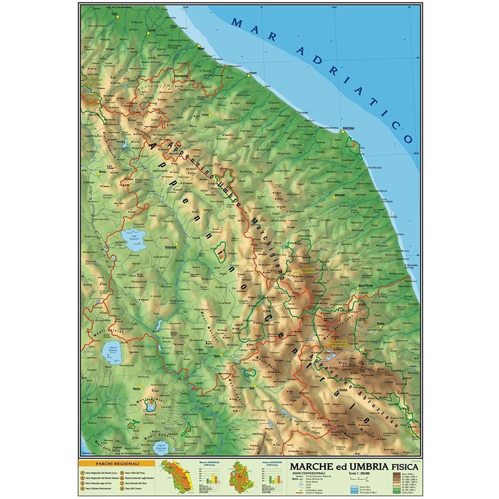 Stampata su materiale plastico lavabile resistente alla lacerazione e all’usura. Completata con aste in trafilato plastico, eleganti e resistenti, munite di appositi ganci che si possono regolare in larghezza per appendere la carta alla parete. Rappresentazione fisica da un lato e politica dall’altro. Dimensioni: cm 100x140 (scala 1:1.100.000). Territorio: Marche e Umbria. Le carte vengono consegnate in custodie tubolari resistenti, per proteggerle e conservarle.
