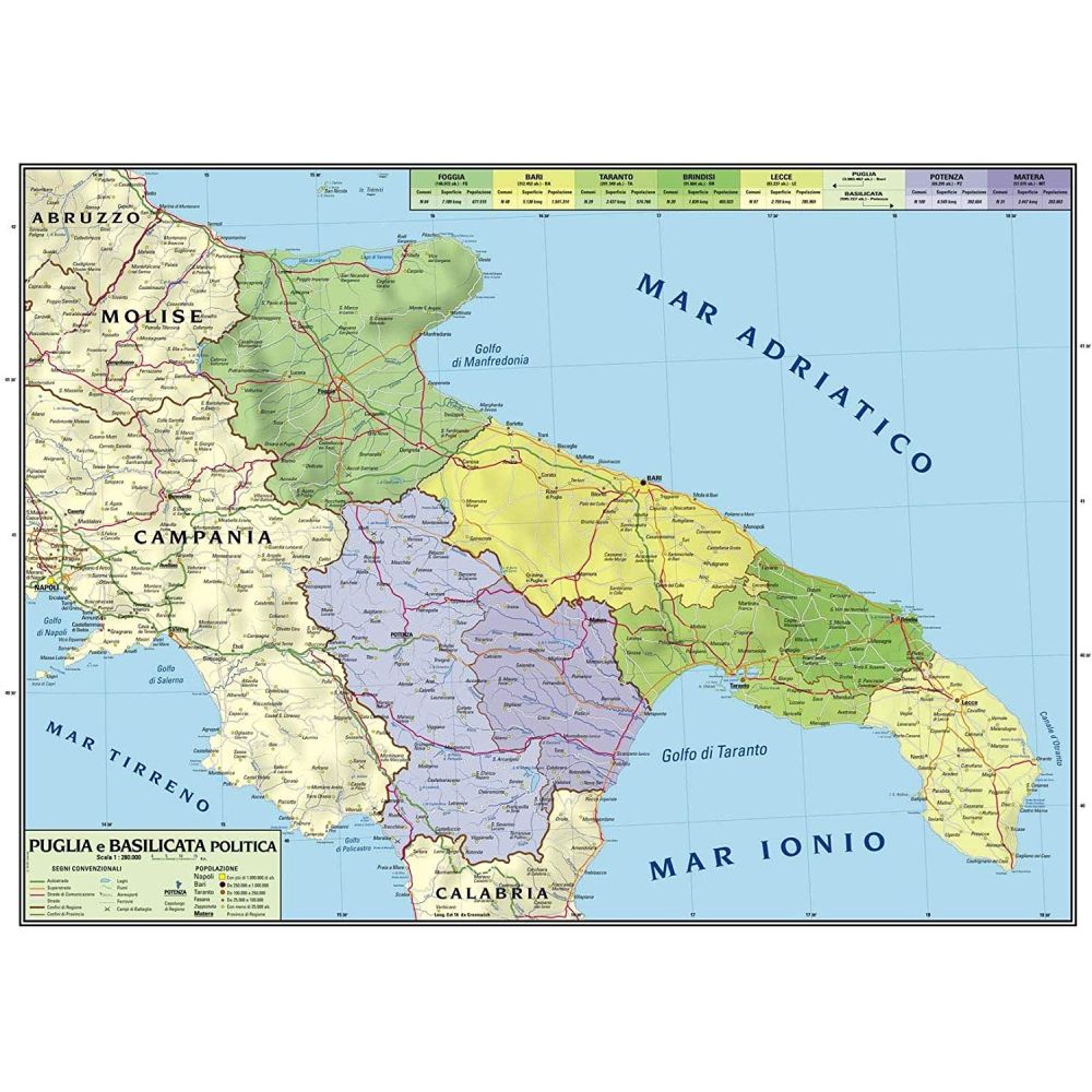 Stampata su materiale plastico lavabile resistente alla lacerazione e all’usura. Completata con aste in trafilato plastico, eleganti e resistenti, munite di appositi ganci che si possono regolare in larghezza per appendere la carta alla parete. Rappresentazione fisica da un lato e politica dall’altro. Dimensioni: cm 100x140 (scala 1:1.100.000). Territorio: Puglia e Basilicata. Le carte vengono consegnate in custodie tubolari resistenti, per proteggerle e conservarle.