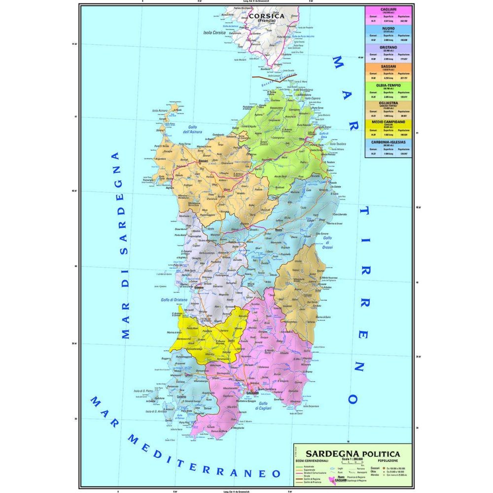 Stampata su materiale plastico lavabile resistente alla lacerazione e all’usura. Completata con aste in trafilato plastico, eleganti e resistenti, munite di appositi ganci che si possono regolare in larghezza per appendere la carta alla parete. Rappresentazione fisica da un lato e politica dall’altro. Dimensioni: cm 100x140 (scala 1:1.100.000). Territorio: Sardegna. Le carte vengono consegnate in custodie tubolari resistenti, per proteggerle e conservarle.