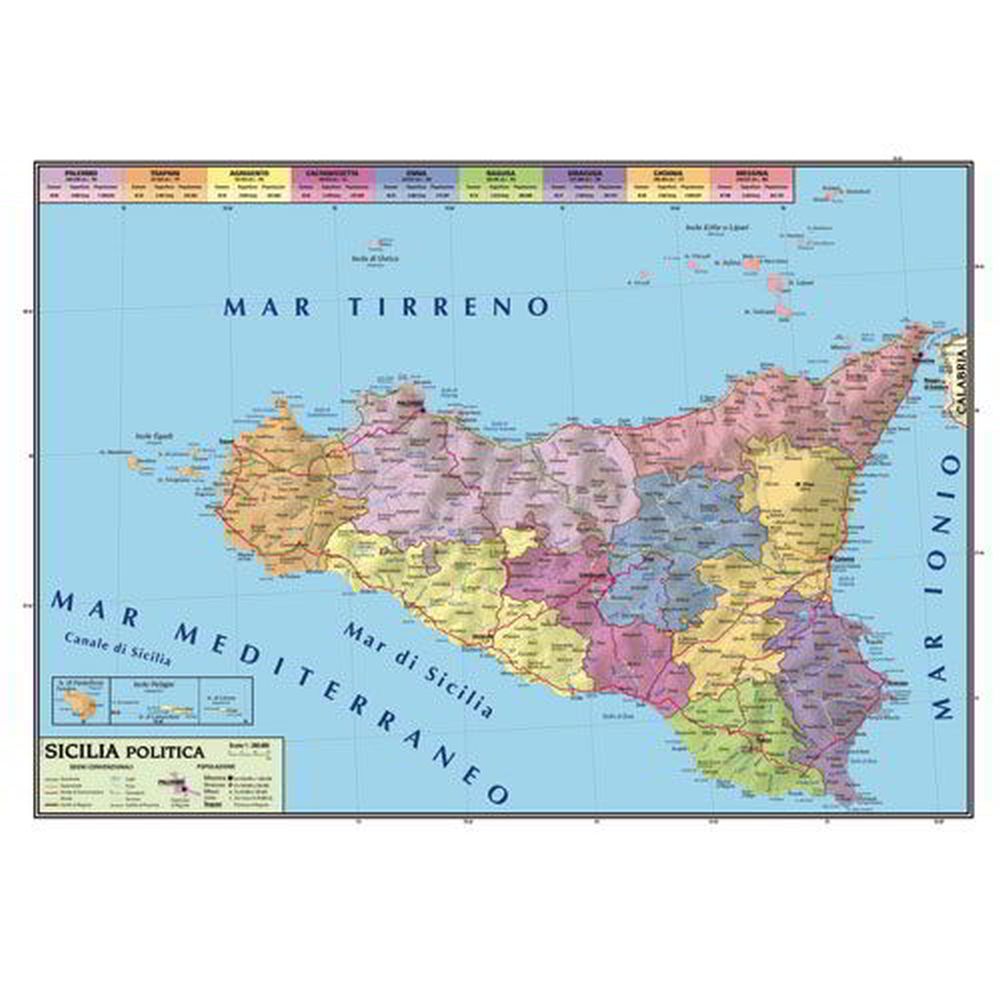 Stampata su materiale plastico lavabile resistente alla lacerazione e all’usura. Completata con aste in trafilato plastico, eleganti e resistenti, munite di appositi ganci che si possono regolare in larghezza per appendere la carta alla parete. Rappresentazione fisica da un lato e politica dall’altro. Dimensioni: cm 100x140 (scala 1:1.100.000). Territorio: Sicilia. Le carte vengono consegnate in custodie tubolari resistenti, per proteggerle e conservarle.