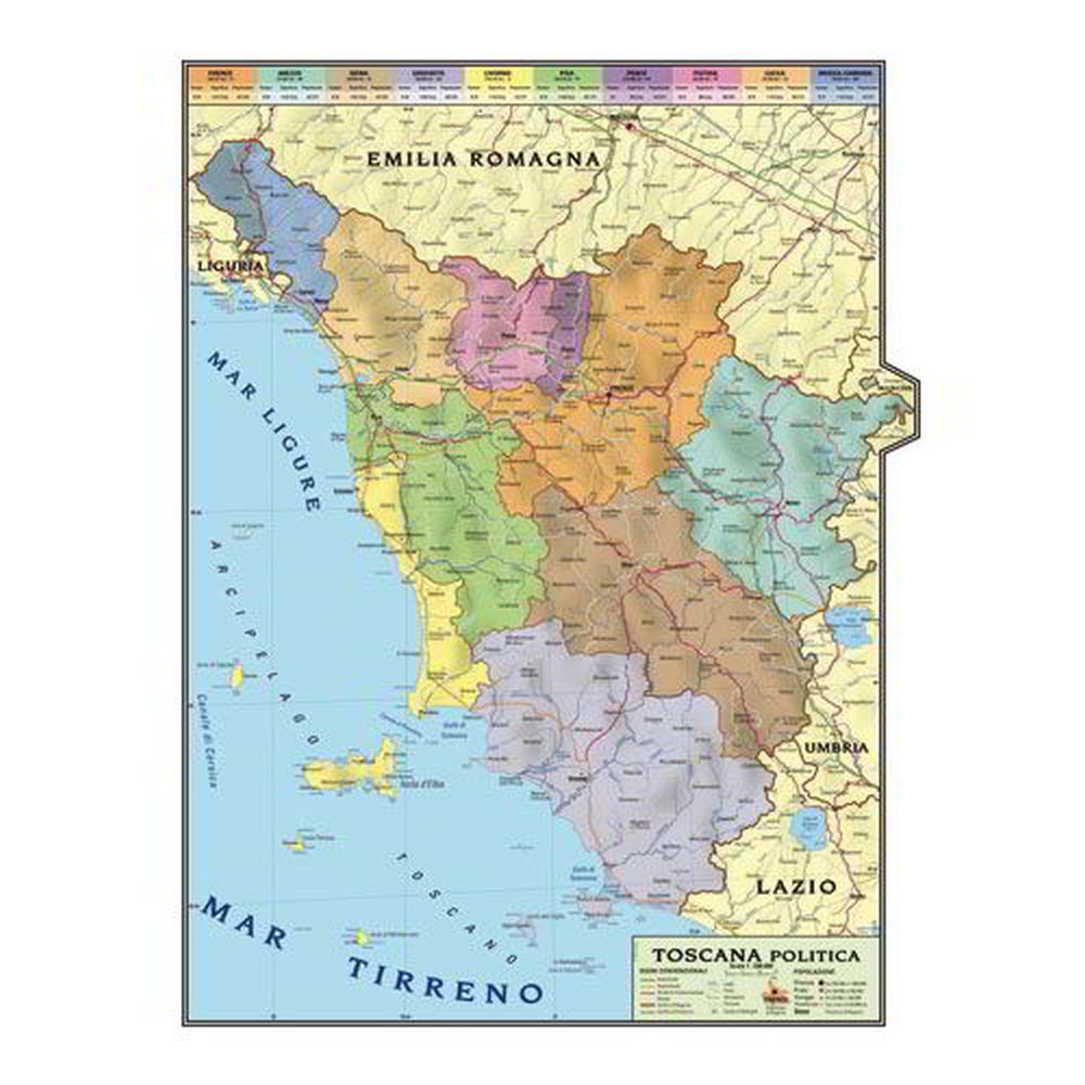 Stampata su materiale plastico lavabile resistente alla lacerazione e all’usura. Completata con aste in trafilato plastico, eleganti e resistenti, munite di appositi ganci che si possono regolare in larghezza per appendere la carta alla parete. Rappresentazione fisica da un lato e politica dall’altro. Dimensioni: cm 100x140 (scala 1:1.100.000). Territorio: Toscana. Le carte vengono consegnate in custodie tubolari resistenti, per proteggerle e conservarle.