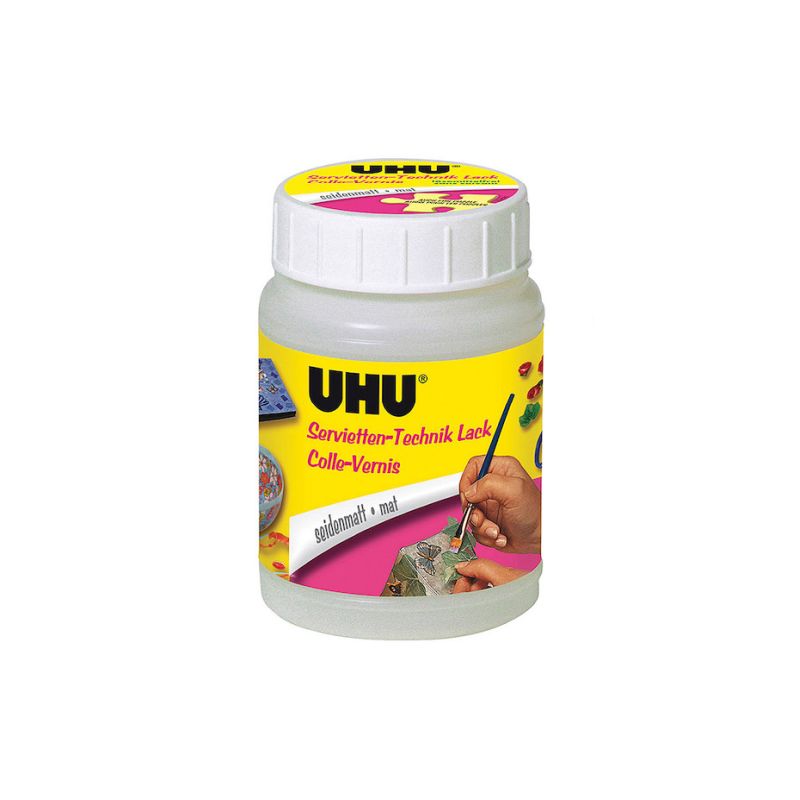 La vernice adesiva UHU Glue Varnish è facile da applicare con un pennello o una spugna. Dopo aver ritagliato il motivo del tovagliolo e sollevato lo strato superiore (stampato), applica una mano di base di colla all'oggetto e poi posiziona il motivo del tovagliolo sulla colla prima che si asciughi e liscialo con cura. Lascia asciugare per un po'. Completa applicando la colla su tutta la superficie. Questo dà il tocco finale al tuo disegno e lo sigilla. Assicurati di non applicare uno strato troppo spesso di vernice adesiva UHU, per limitare il restringimento della carta. Se vuoi creare qualcosa con carta o cartoncino (ad esempio inviti o biglietti d'auguri), applica piccole gocce di prodotto per fissare i motivi invece di applicare una mano di base.