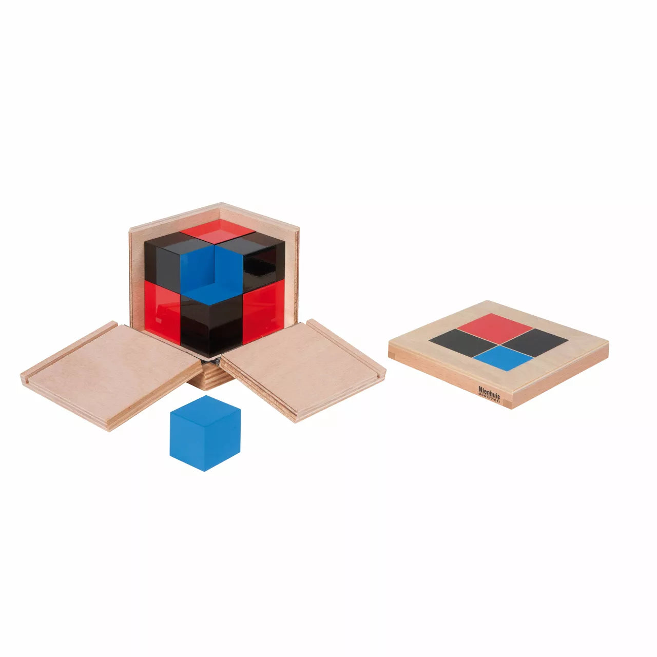 Il Cubo del Binomio è la rappresentazione concreta della formula algebrica (a + b)³. I fattori dell'equazione sono rappresentati da cubi e prismi in legno contenuti in una speciale scatola di legno con i colori-guida riprodotti sul coperchio, dotata di due facce ribaltabili per facilitare la rimozione e la ricollocazione dei pezzi.
