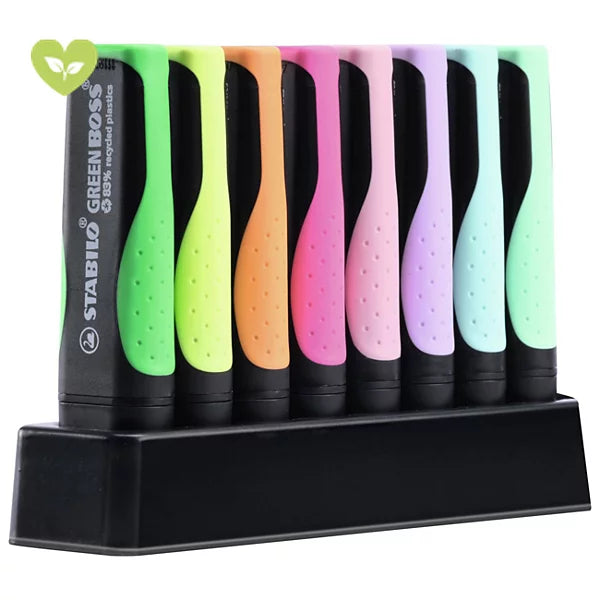 • STABILO GREEN BOSS Pastel è l'evidenziatore ecosostenibile in plastica riciclata all'83% dotato di comoda impugnatura in gomma. E' realizzato con l'83% di plastica riciclata per conservare le risorse naturali ed evitare gli sprechi. Grazie alla tecnologia Anti-Dry-Out resiste fino a 4 ore senza tappo garantendo il massimo della performance. Con la sua punta inclinata e la doppia ampiezza (2 mm e 5 mm), è possibile evidenziare in modi diversi: con tratti più grossi per sottolineare i testi o con tratti più fini per una maggiore precisione. Disponibile in 8 colori assortiti: 4 pastello e 4 fluo.