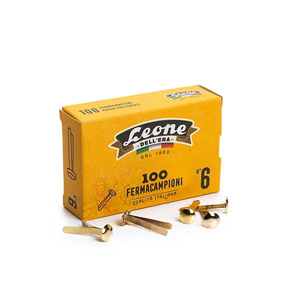 • Con una finitura in ottone brillante, i fermacampioni di Leone Dell'Era, sono perfetti per fissare in modo organizzato ed ordinato fogli, documenti e campioni in stoffa.