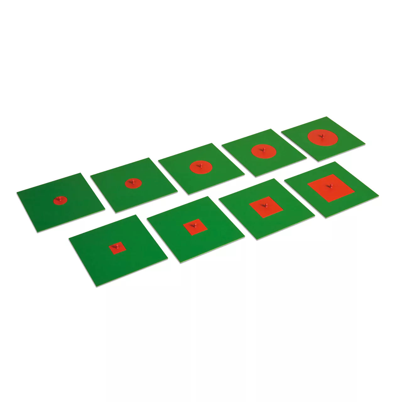 Questo materiale viene utilizzato per lo studio delle figure inscritte e concentriche. Il materiale è costituito da 9 telai metallici verdi con fondo e inserti rossi, con 1 set di 5 cerchi di diametro decrescente e 1 set di 4 quadrati di lunghezza e larghezza decrescenti.