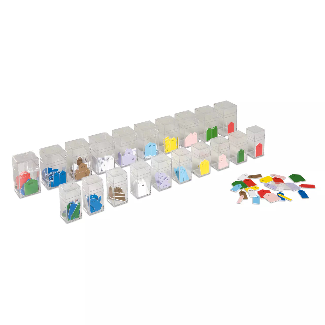 20 set di frecce di plastica colorate con i multipli stampati su di esse per l'utilizzo negli esercizi di conteggio con le catene di perle corte e lunghe. Sono incluse 20 scatole di plastica trasparente.