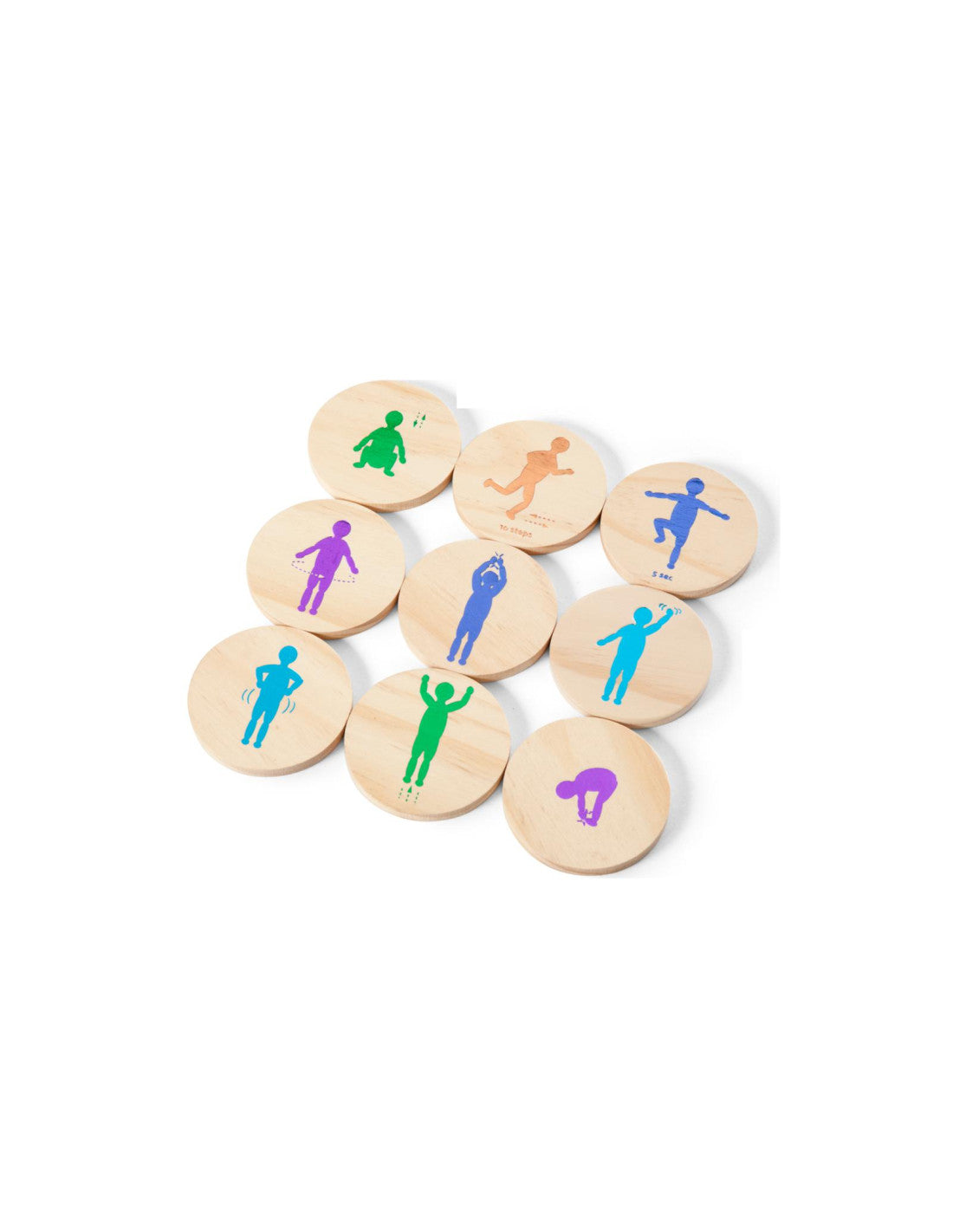 Gioco di memoria e movimento, migliora l'equilibrio e la consapevolezza del proprio corpo. Contiene 18 medaglie in legno (8 cm di diametro) decorate con i movimenti da eseguire. Sacca di cotone inclusa