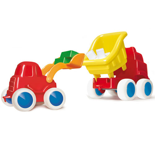 - 1 Camion con rimorchio realizzati in plastica morbida e flessibile, privi di parti staccabili e ftalati: massima sicurezza per i più piccoli.