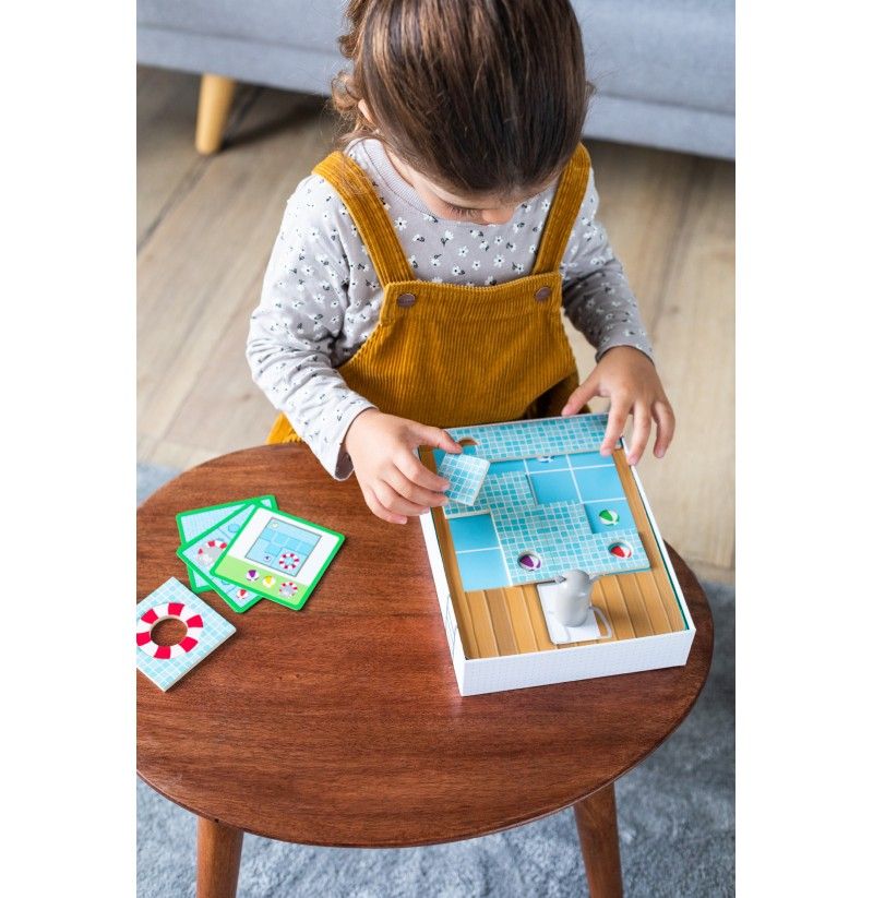 Gioco educativo prescolare il cui obiettivo è costruire correttamente con i pezzi di legno i modelli delle carte in base al galleggiante e alle palline che devono essere visibili nella carta sfida scelta. La scatola funge da base del gioco e i pezzi devono essere posizionati come indicato sulla carta. Queste carte hanno un livello di difficoltà progressivo, tre in totale, e variano man mano che vengono eliminati gli indizi per il posizionamento dei pezzi. Il gioco è autocorrettivo: ogni sfida ha una soluzione sul retro, in modo che i bambini possano verificarla da soli. Può anche essere giocato individualmente risolvendo ogni sfida o con altri giocatori in cui i bambini competono l'uno contro l'altro. Sviluppo del ragionamento logico e dell'orientamento spaziale. Età consigliata +3 anni. Osservazione e agilità visiva. I bambini si divertiranno a sviluppare il ragionamento logico e l'orientamento visivo. Contiene:5 pezzi di legno, 1 ippopotamo, base (reversibile) e 30 carte sfida con 3 livelli di difficoltà.