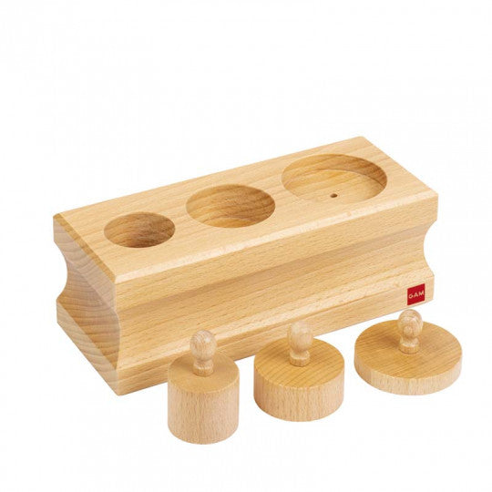 Questo materiale stimola la coordinazione occhio-mano. Si tratta di un blocco di incastri solidi con tre cilindri utilizzato per introdurre il bambino alla prima fase di discriminazione visiva delle dimensioni. L'altezza dei cilindri diminuisce progressivamente mentre il diametro aumenta dal più alto e stretto al più basso e largo. Sono realizzati in legno massello di faggio con finitura al naturale.