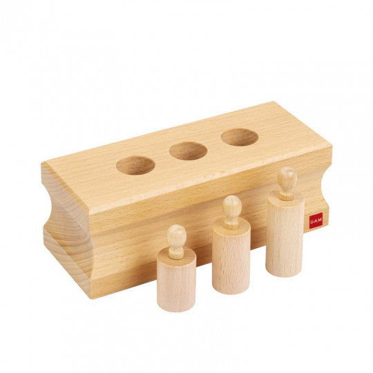 Questo materiale stimola la coordinazione occhio-mano. Si tratta di un blocco di incastri solidi con tre cilindri utilizzato per introdurre il bambino alla prima fase di discriminazione visiva delle dimensioni. L'altezza dei cilindri aumenta progressivamente dal più basso al più alto mentre il diametro rimane costante. Sono realizzati in legno massello di faggio con finitura al naturale.