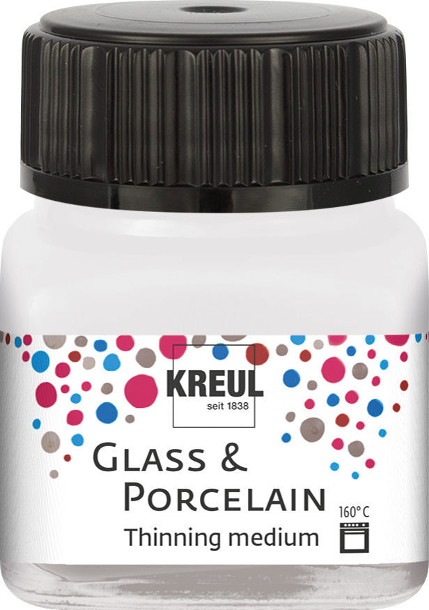 Il medium diluente per vetro e porcellana KREUL è un medium trasparente per diluire i colori Chalky, Classic e Clear di KREUL Glass & Porcelain. Si tratta di colori per colorare e decorare contenitori in vetro, porcellana e ceramica resistenti al calore, nonché terracotta e metallo. Vengono cotti a 160 °C e sono quindi impermeabili, lavabili in lavastoviglie e resistenti alla saliva.