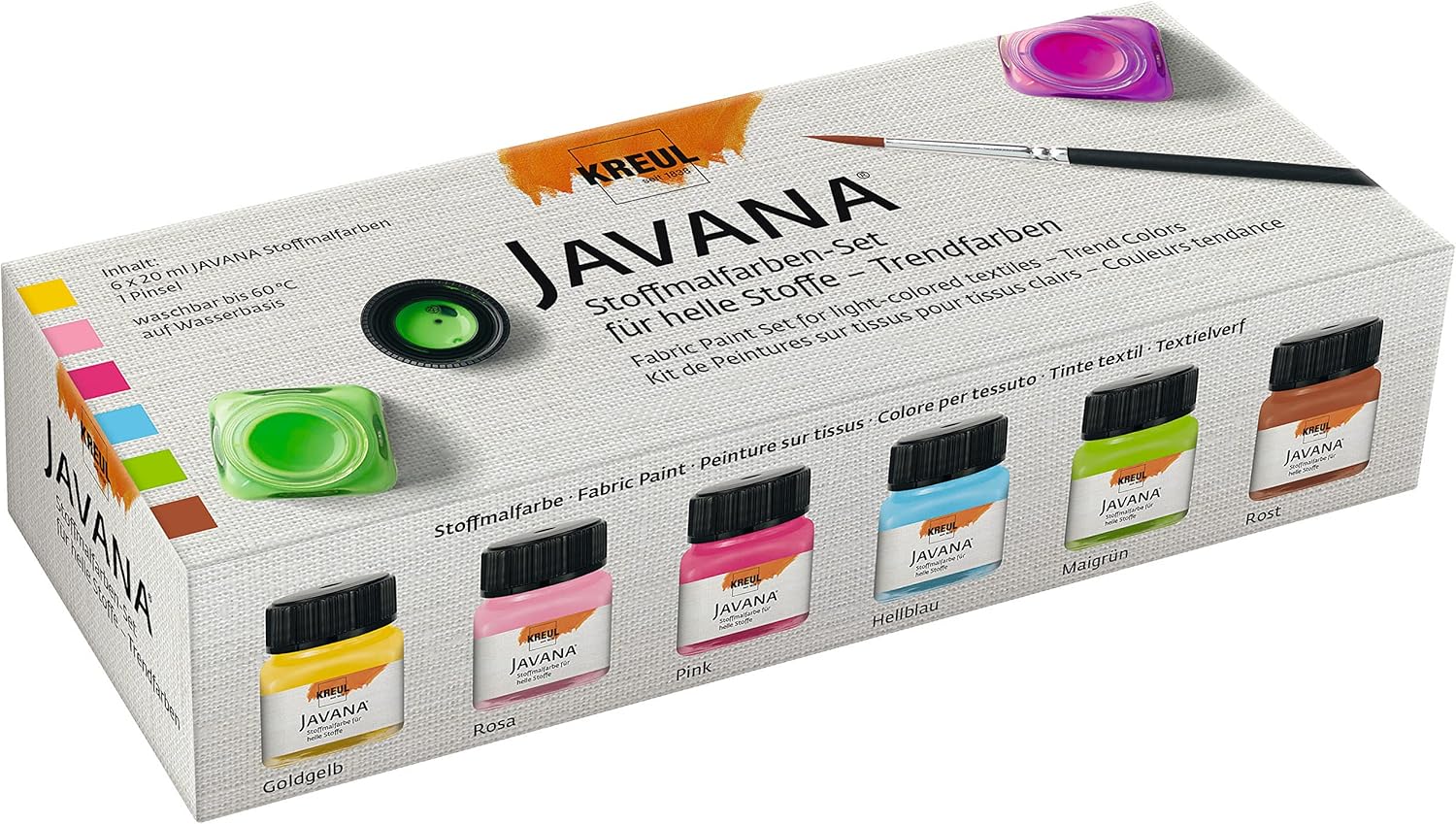 Gli amanti del fai da te amano il design personalizzato dei tessuti e cercano una tonalità di colore coordinata per i loro pezzi unici. Con le vernici per tessuti KREUL Javana, morbide e cremose, adatte a tessuti chiari, è possibile creare disegni colorati e delicati su t-shirt o borse. A seconda dell'umore e del desiderio, i creativi arredano il loro soggiorno e creano un'atmosfera accogliente con motivi e fantasie accattivanti, come t-shirt, scialli, sciarpe, cuscini, copridivani e paralumi. I colori brillanti possono essere applicati con un pennello o un rullo su un'ampia superficie e penetrano in profondità nel tessuto. Una volta fissati, sono resistenti alla luce e lavabili fino a 60 °C. Il set di colori è ideale per i principianti perché contiene i colori freschi più importanti per dipingere.