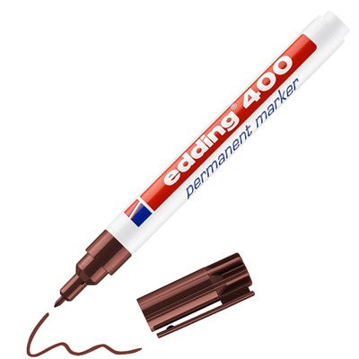 Marcatore permanente edding 400. Marcatore ricaricabile per scrivere, dipingere e marcare quasi tutti i materiali, compresi metallo, vetro e plastica. Inchiostro permanente, inodore, senza aggiunta di toluene/xilene, resistente alle sbavature e all'acqua, resistente alla luce. Punta tonda sostituibile. albero di plastica. Cappuccio reversibile nel colore della scritta. Colore dell'asta: bianco. Larghezza della linea: circa 1 mm. Colore della scritta: MARRONE.