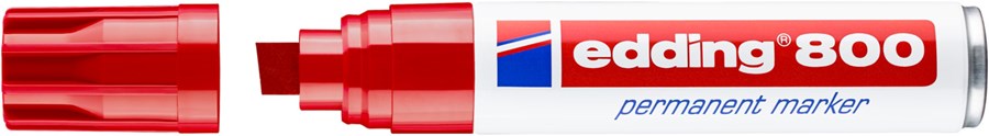 Marcatore permanente edding 800. Marcatore ricaricabile per scrivere, dipingere e marcare quasi tutti i materiali, compresi metallo, vetro e plastica. Inchiostro permanente, inodore, senza aggiunta di toluene/xilene, resistente alle sbavature e all'acqua, resistente alla luce. Punta a cuneo sostituibile. albero in alluminio. Cappuccio reversibile nel colore della scritta. Colore dell'asta: bianco. Larghezza della linea: circa 4 - 12 mm. Colore della scritta: ROSSO.