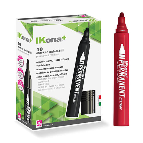 Marcatore permanente Ikona+ per scrivere, dipingere e marcare quasi tutti i materiali, compresi metallo, vetro e plastica. Inchiostro permanente punta arrotondata, albero di plastica. Colore dell'asta: rosso. Larghezza della linea: circa 1,5 - 3 mm. Colore della scritta: Rosso.