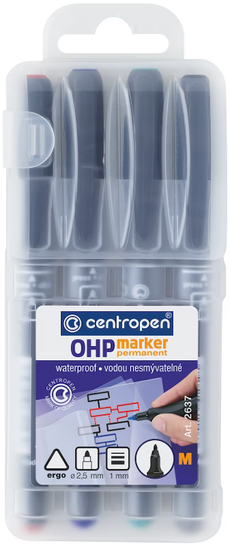 Confezione 4 Marker con punta sintetica indeformabile studiati per scrivere su fogli trasparenti per proiezioni, diapositive, cd, pellicole, lucidi, ecc..