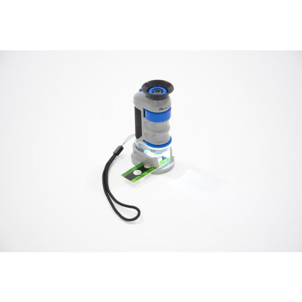 Microscopio tascabile illuminato robusto e semplice che può essere utilizzato per l'osservazione ingrandita istantanea all'interno o all'esterno. Micro-slide aggiuntive (700099) sono disponibili per l'acquisto separatamente. - Ingrandimento ottico 20x e 40x . Illuminazione a LED super luminosa: - Include cinghia, diapositiva preparata e supporto - Batterie incluse. Supporta le seguenti aree di apprendimento: • Comprendere il mondo – osservazione • Capire il mondo. Specifiche: Dimensioni: 100x80x30mm. Richiede 3 batterie a bottone AG13 / LR44 (incluse). Età: adatto da 8 anni.
