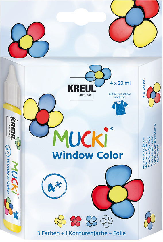4 penne da 29 ml ciascuna (giallo, rosso, blu scuro, contorno nero), 1 foglio di plastica rigida MUCKI Window Color, 100 x 115 mm
