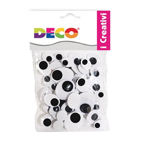Occhietti adesivi con iride mobile,per realizzare e personalizzare pupazzi, burattini, animali bidimensionali e tridimensionali o per dare un tocco in più a disegni. Confezione da 50 occhi. Forma: Ovale. Dimensione: Assortite.