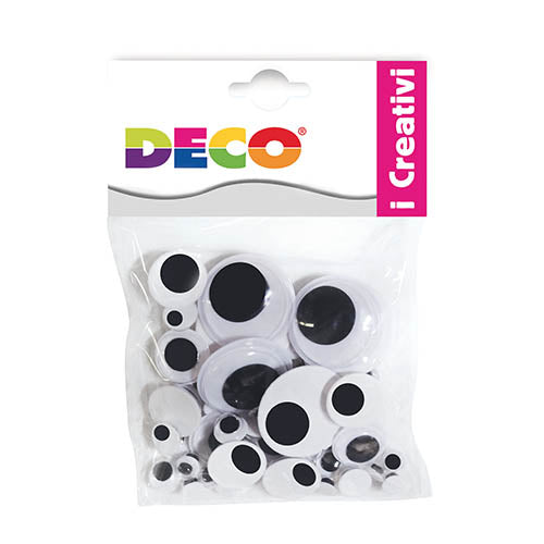 Occhietti adesivi con iride mobile, per realizzare e personalizzare pupazzi, burattini, animali bidimensionali e tridimensionali o per dare un tocco in più a disegni. Confezione da 50 occhi. Forma: Tonda. Diametro: Assortiti.