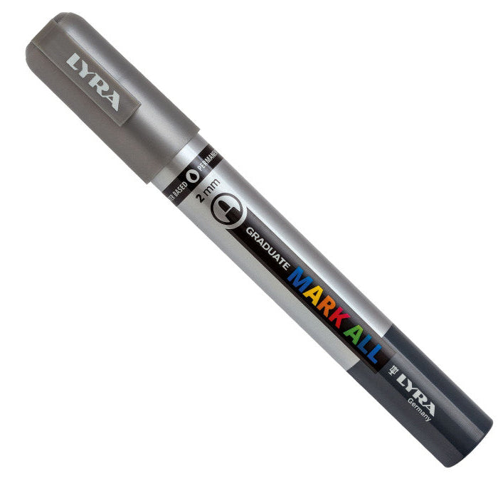 MARK ALL è un marcatore a tempera multi superficie. Da un tratto sottile fino ad uno spesso e largo, i marcatori Lyra Graduate sono formulati con inchiostri a base d' acqua per decorare e disegnare ogni tipo di superficie e rendere ogni creazione unica.