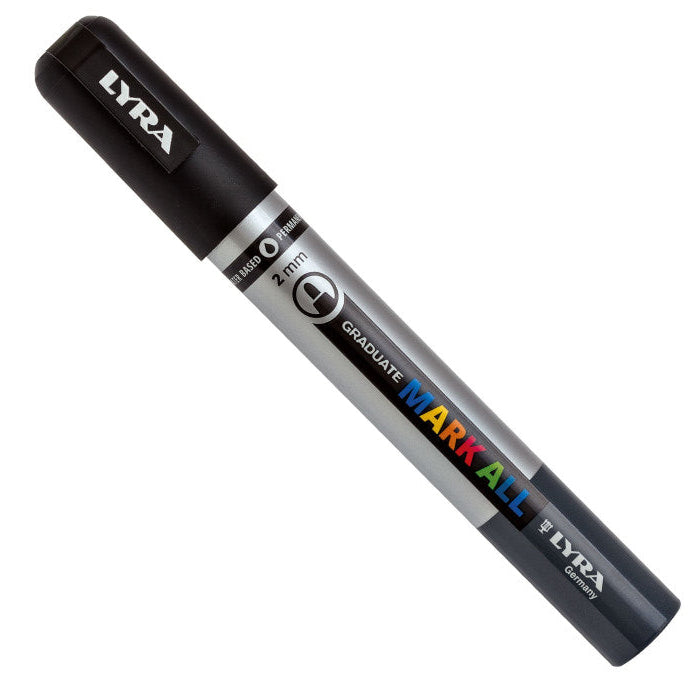 MARK ALL è un marcatore a tempera multi superficie. Da un tratto sottile fino ad uno spesso e largo, i marcatori Lyra Graduate sono formulati con inchiostri a base d' acqua per decorare e disegnare ogni tipo di superficie e rendere ogni creazione unica.