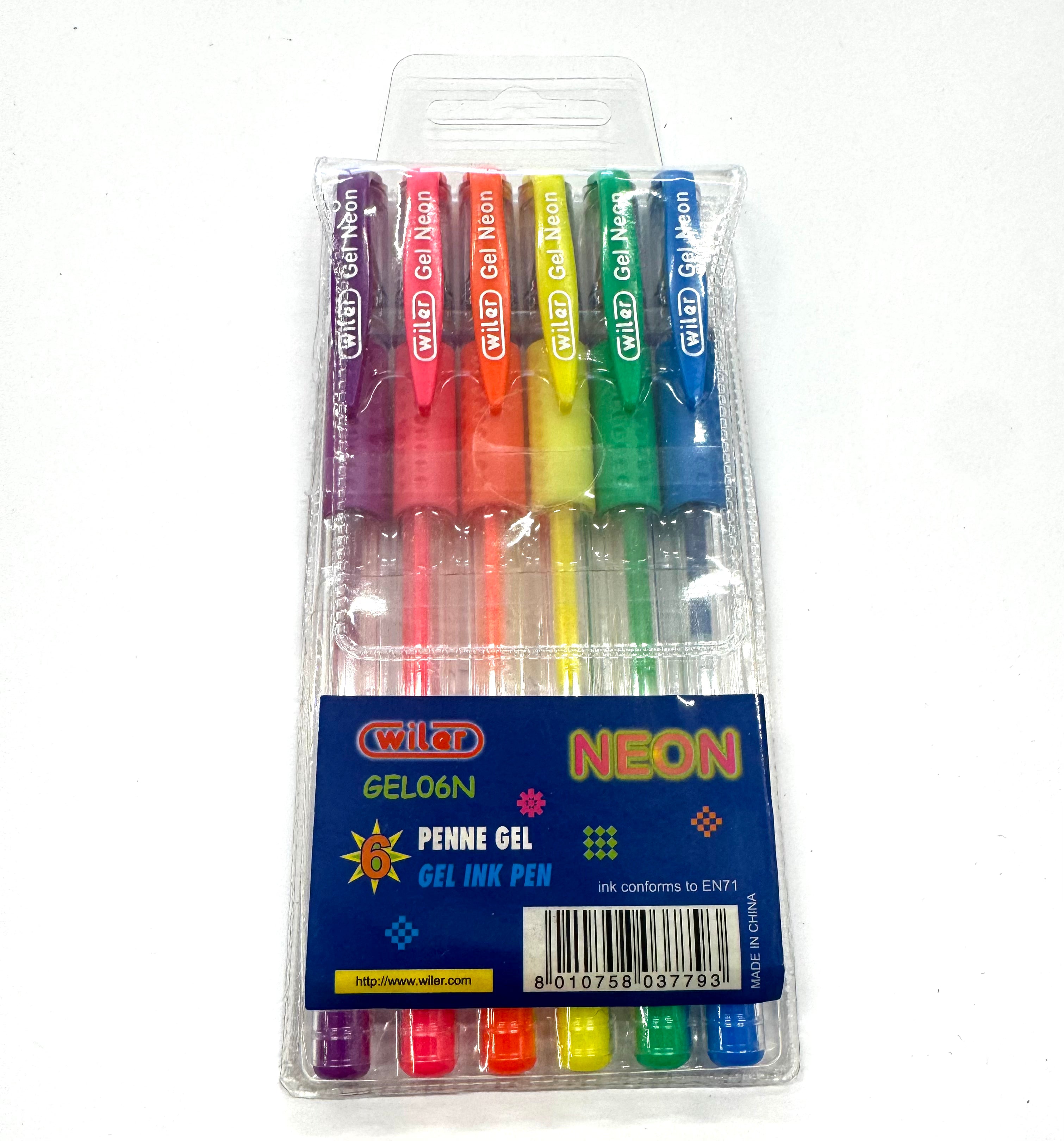 Busta in plastica con 6 penne gel colori neon ed impugnatura morbida per una piacevole scrittura.