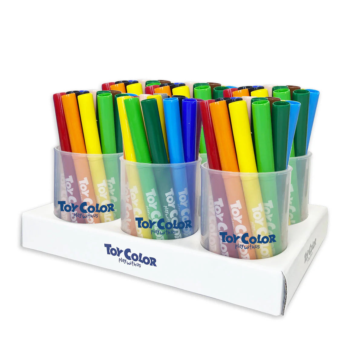 Pennarelli Toy Color certificati per bambini dai 3 anni. Con punta grossa non removibile, diametro di 5 mm. Inchiostro super lavabile dalle mani e dalla maggior parte dei tessuti. Prodotti in Italia.