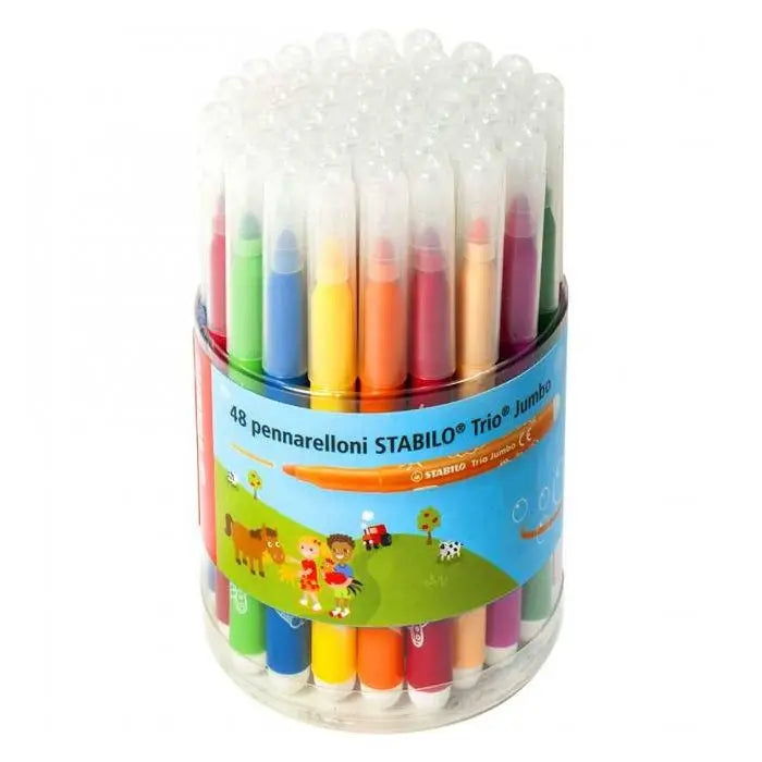 Pennarello con punta XL, tratto pari a 3 mm con impugnatura triangolare e punta super-resistente. Inchiostro super-lavabile con cappuccio ventilato anti-soffocamento.